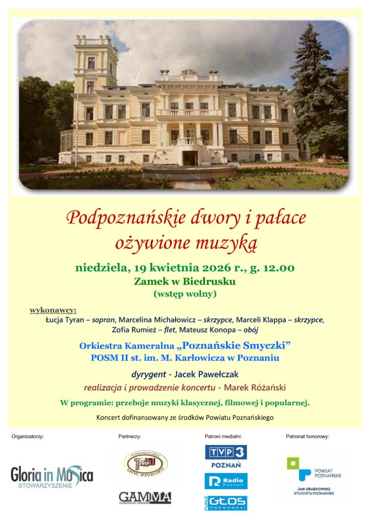 Powiat Poznański od 14 lat wspiera naszą działalność w tym obszarze. Tym razem zawitamy do uroczego Zamku w Biedrusku, gdzie 19 kwietnia 2026 roku o g. 12.00 Orkiestra Kameralna „Poznańskie Smyczki” pod dyr. Jacka Pawełczaka wraz z solistami wykona koncert z utworami w klimacie wiosennym.